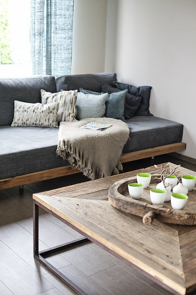 Gleiche Farbpalette im Wohnzimmer von miraculusa: Kissen sind immer eine gute Idee, um die Farbgestaltung zu verändern.