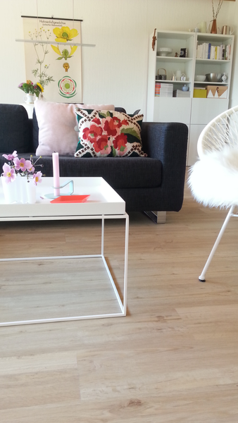 Moosrose setzt in ihrem neuen Zuhause auf Farbe und dekoriert ihren Lieblingsort Sofa mit farbenfrohen Kissen.