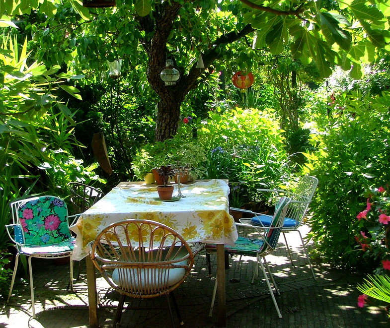 Kayvintage zeigt ihren schönen Sitzplatz im Garten. Die unterschiedlichen Lichtquellen im Baum sind genauso toll wie der Mut zum Muster!