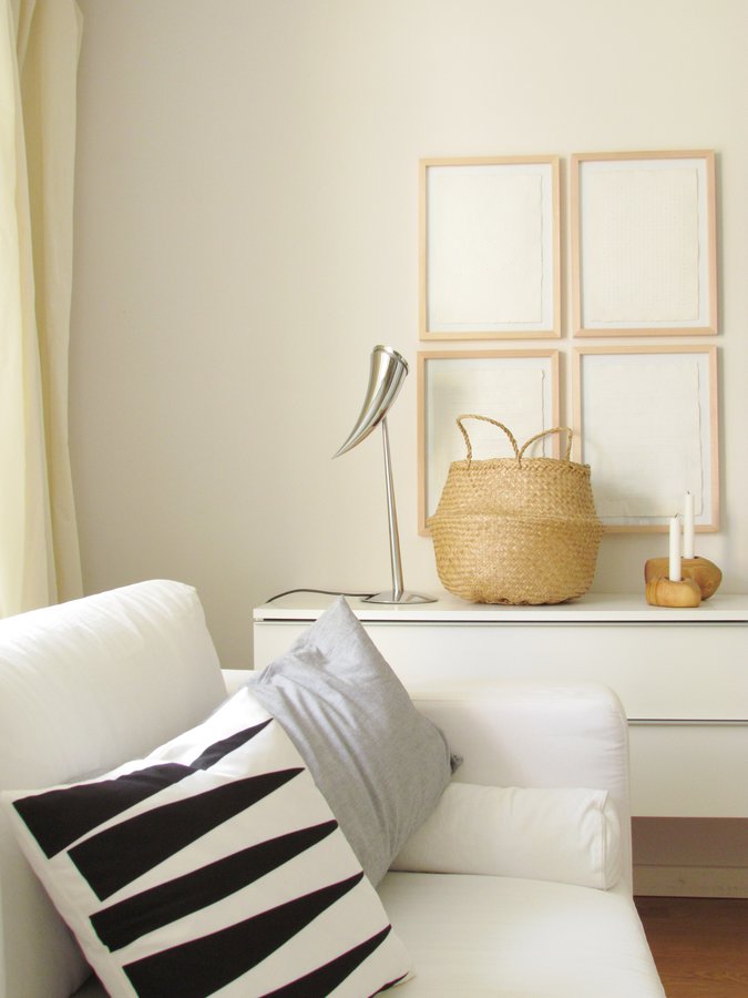 Korb, Weißes Sidebord, Kissen, Weißes sofa, Kerzenständer aus Holz, Holz Kerzenständer, Natural Basket