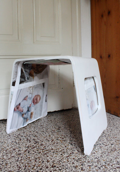 Im Brigitte-Kreativ-Extra hat mich vor einiger Zeit eine bemalte Tischplatte fasziniert. Da unser Esstisch dazu aber nicht taugt, kam mir gerade recht, dass sich von unserem alten Ikea-Hocker die Tafelfolie löste (bzw. die Kinder solange daran herumgezupft haben, bis sie ein Loch hineingerissen hatten...). So konnte ich direkt ans Werk gehen, die Tafelfolie abziehen und dem Hocker einen neuen Look verpassen