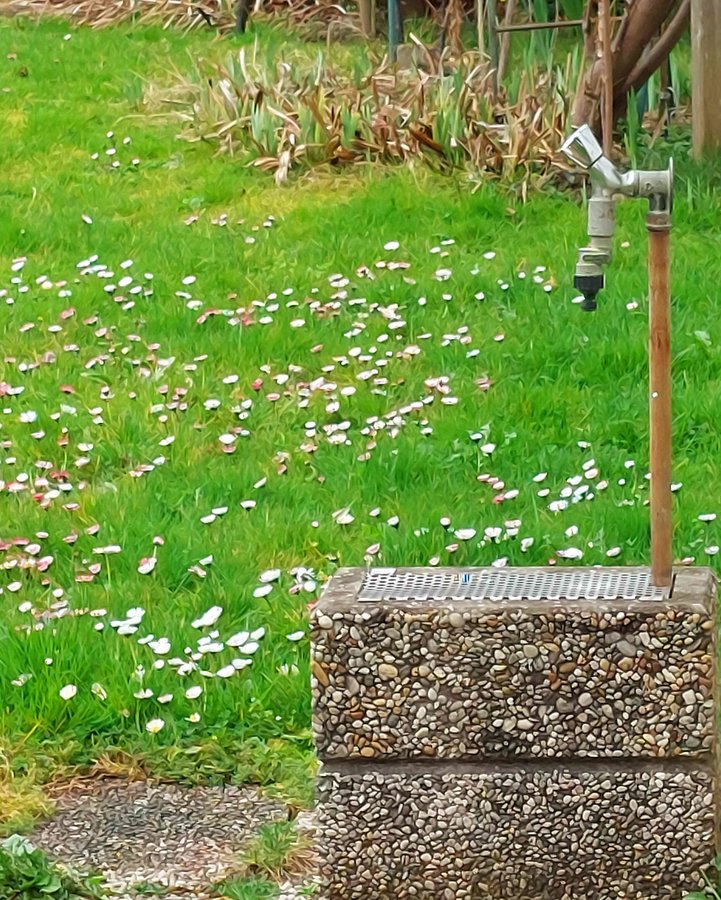 Garten, Blumenwiese, Gänseblümchen, Frühlingswiese, Brunnen, Gartenblick, Auenland