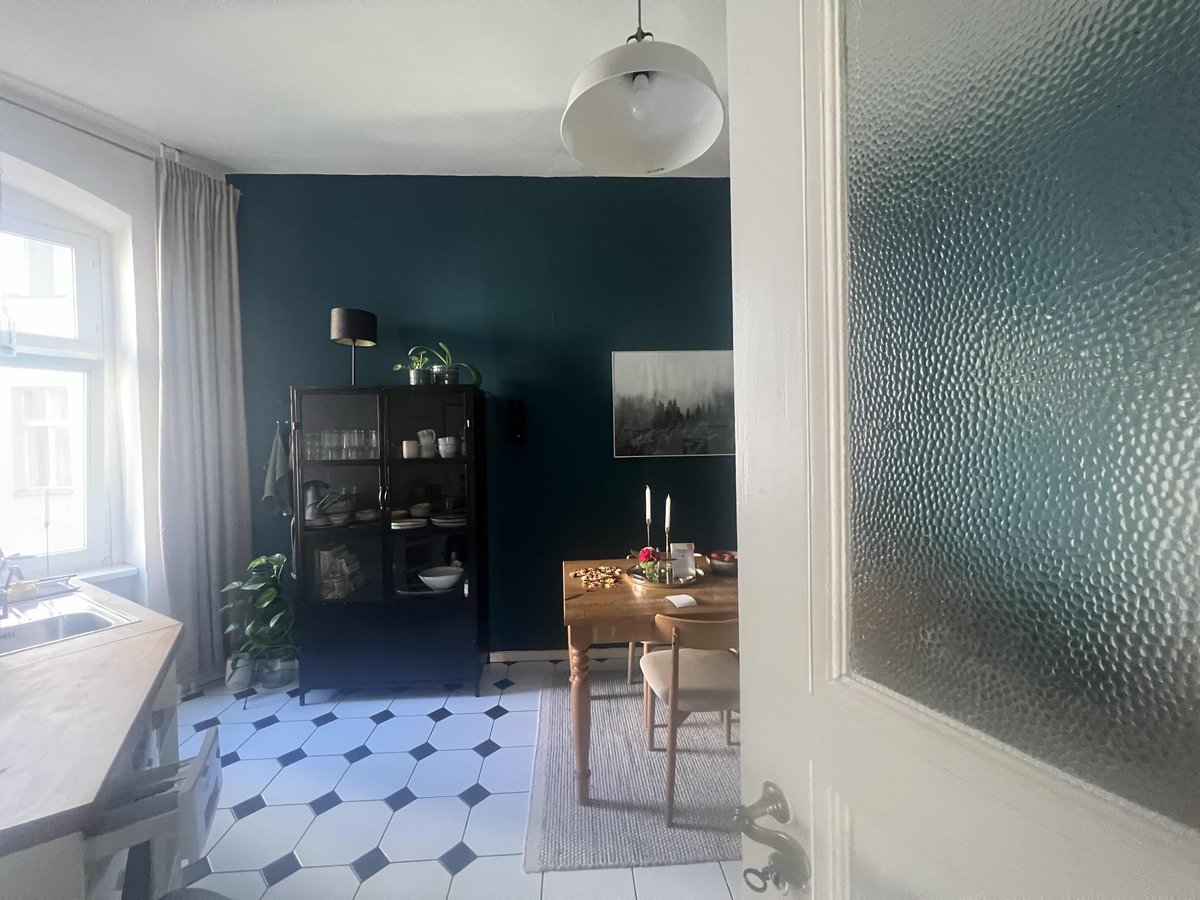 Küche, Petrol, Fliesen, Kacheln, Vitrine, Holztisch