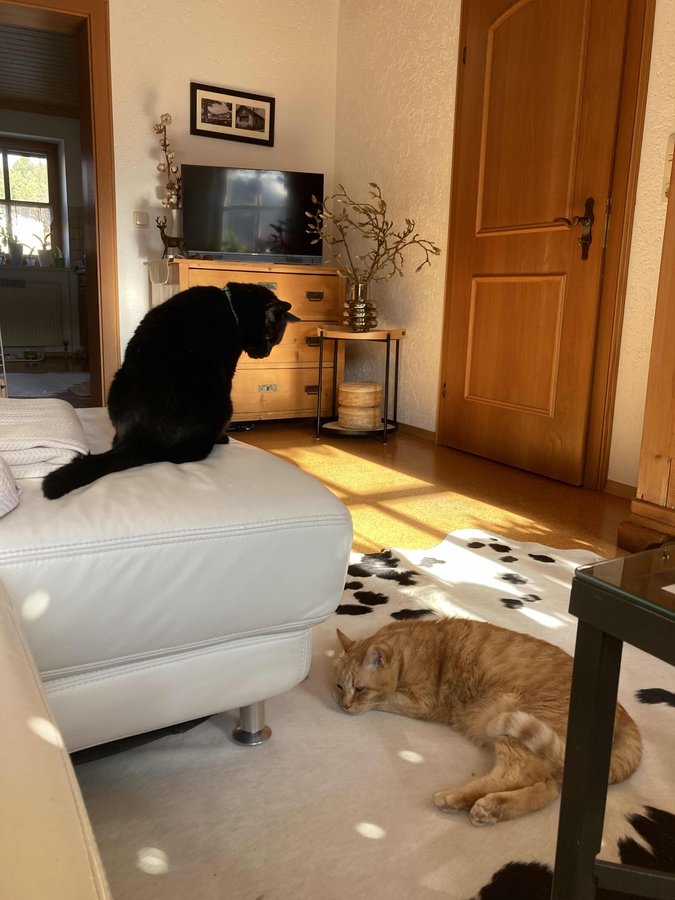 Wohnzimmer, Katzen, Kuhfell, Magnolienzweige