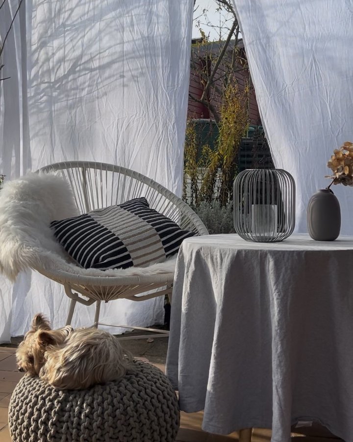 Kleingarten, Garten, Schattenplatz, Terrasse, Gartenmöbel, Vorhänge, Sichtschutz, Acapulco Chair, Puff, Schrebergarten