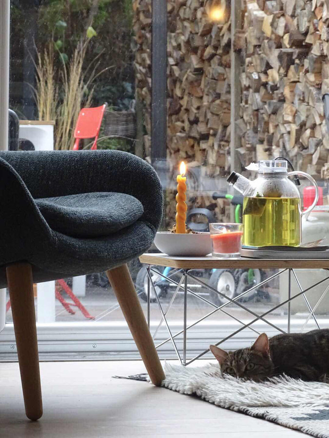 skandinavisch Wohnen, Katze, Sessel, Wohnzimmer, Sofaecke, Kelim, Kerzenhalter, Herbst, Herbstmood, Gartenblick, Teestunde, Cozy, Skandi, Skandinavisch, gedrehte kerzen, Teelicht, November