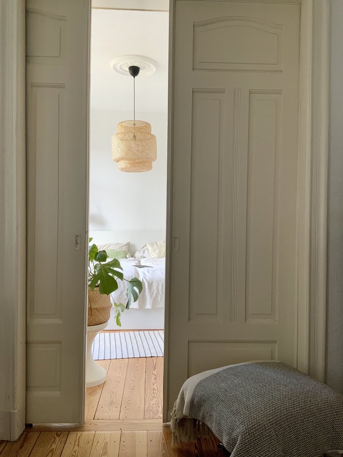 Boho, Sonne, Sommer, Bett, Scandi, Natürlich, Nordic, Pflanzen, Tageslicht, Weiß, Lampe, Wohnstil, Schlicht, Vintage, Schiebetür, Parkett, Hocker, Teppich, Gemütlich, Holzdielen, Dielenboden, Plastikhocker, Flohmarktfund, Monstera, Altbau, Altbauliebe, Schlafzimmer