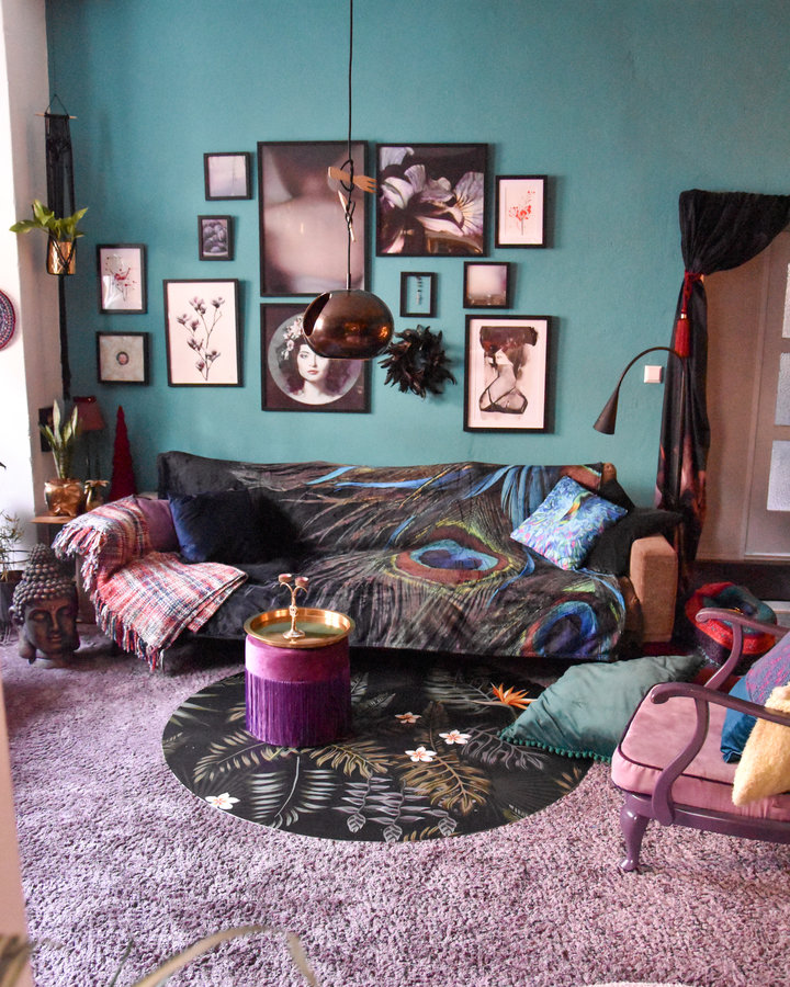Wohnzimmer, Teppich, Sofa, Boho, Vintage, Deko im Wohnzimmer, deko, Wandfarbe, Türkis, Bildergalerie