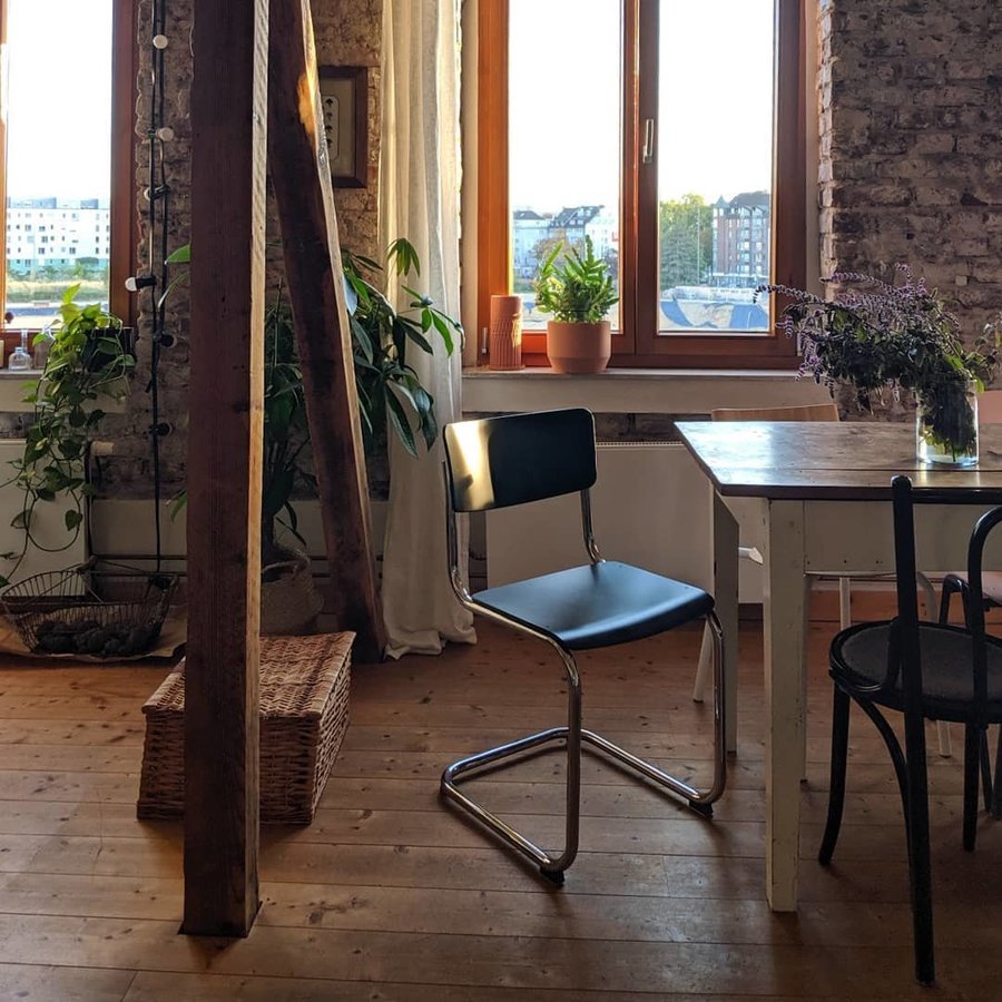 "Thonet erkannte früh das Potential des beeindruckenden Werkstoffs Stahlrohr und sicherte sich über die Kontakte zum Dessauer Bauhaus die Rechte an den besten Entwürfen von Avantgardisten wie Ludwig Mies van der Rohe, Mart Stam oder Le Corbusier – und Marcel Breuer. 1928 wurde ein Vertrag zwischen Thonet und Breuer über ein eigenes Stahlrohrprogramm geschlossen, ein Jahr später erwarb Thonet Breuers Firma „Standard Möbel“ und brachte eine umfassende Stahlrohrkollektion auf den Markt. In diesen Jahren entstanden zahlreiche Entwürfe des jungen Architekten für Thonet." (www.thonet.de) 6 Jahre lang saß ich während meines Studiums auf dem Thonet Freischwinger, der mich bei meiner "Erstiwoche" an der Hochschule Düsseldorf bis zu meiner Abschlußausstellung zum Master begleitet hat und immer an die bisher schönste Zeit meines Lebens erinnern wird. Was für ein Zufall also, dass ich genau diesen Stuhl Jahre später bei solebich gewonnen habe und er seither unseren Küchentisch schmückt!