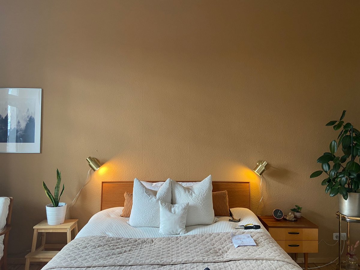 Wandfarbe, Braun, Holzbett, Wandlampe, Plaid, Nachttisch, Schlafzimmer