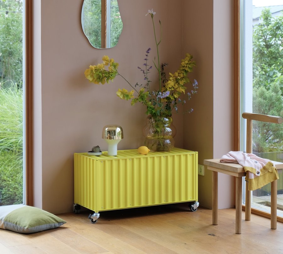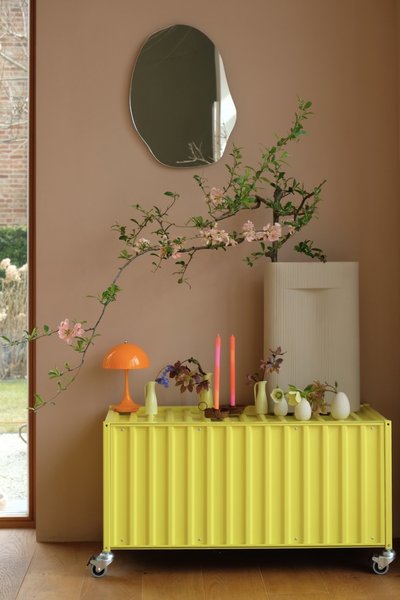 Die selbst gemischte Wandfarbe im Wohnzimmer nennt Alex „Dusty Peach“. Der gelbe Container DS bildet einen spannenden Kontrast zu ihr. „Hochwertige Wandfarben zu verwenden, macht viel weniger Arbeit“, findet Alex. „Meist genügt ein Streichvorgang und man kleckert viel weniger!“ Besonders attraktiv findet sie die Farben von Farrow & Ball, die mit vielfältigen Farbpigmenten überzeugen.