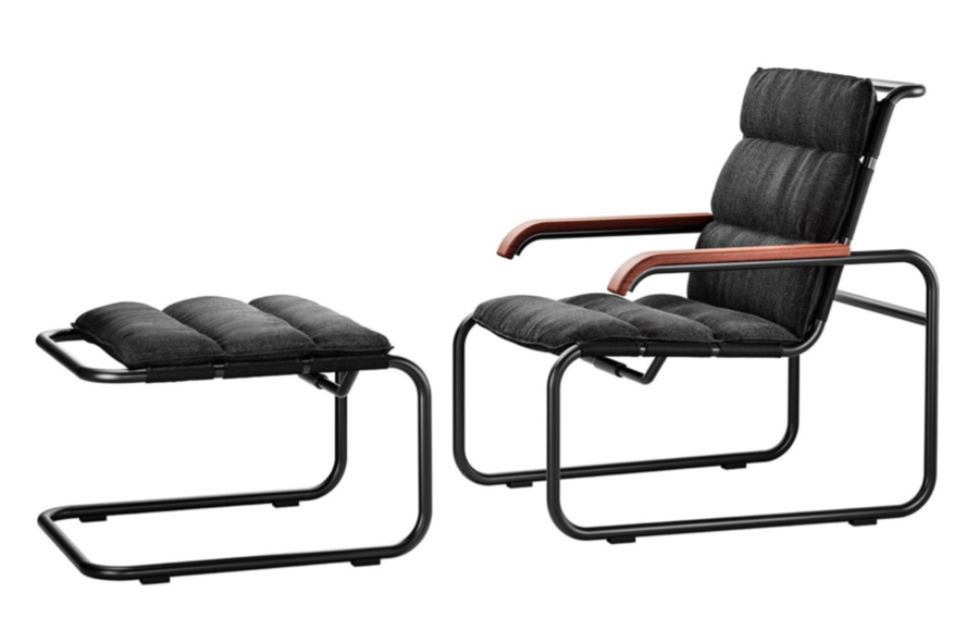Der Freischwinger mit Armlehnen und ebenfalls freischwingendem Fußhocker wurde von Marcel Breuer 1929 entworfen. Passende Polster in Schwarz sorgen für noch mehr Komfort.
