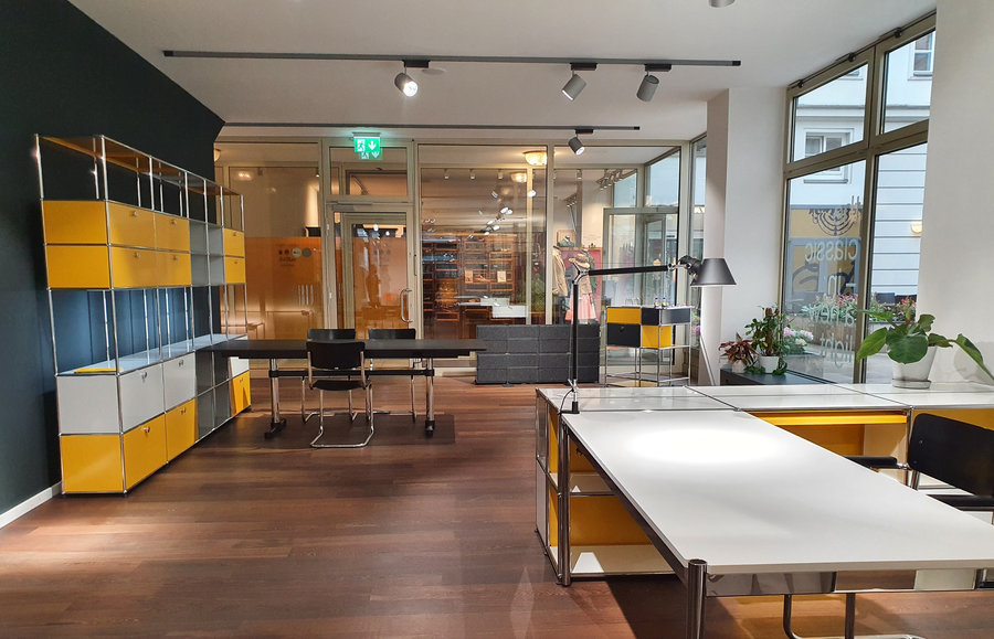 So sieht der USM Showroom normalerweise aus. Beeindruckend, wie die für uns maßgefertigten Vorhänge von Luiz den Raum verändert haben.