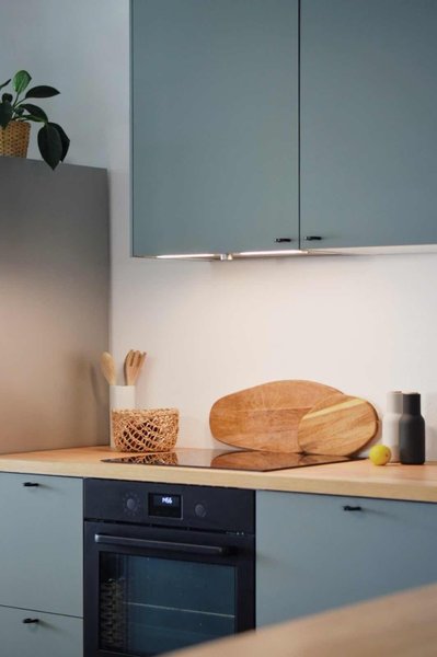 Die IKEA-Küche mit graugrünen Fronten und Arbeitsplatte aus Eiche ist der tägliche Mittelpunkt.