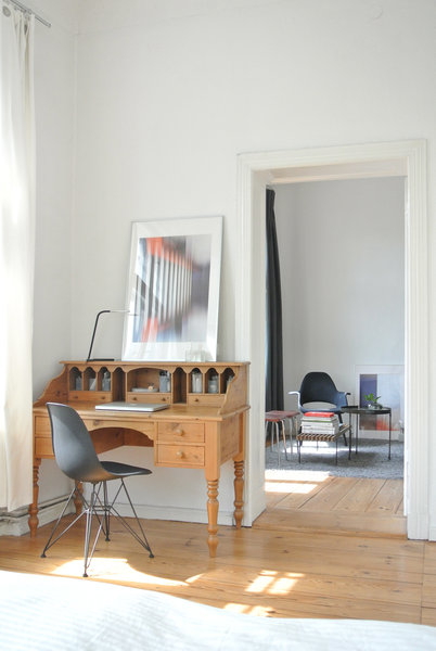 Zusammen mit meinem Mann wohne ich in einer 75-qm-Altbauwohnung mit hohen Räumen, Holzdielen und tollen Details wie Stuck. Für mich ist sie manchmal gefühlt – durch meine Leidenschaft für Möbel – etwas zu klein. Mein Mann ist allerdings sehr glücklich, so wie es gerade ist, denn dadurch komme ich nicht täglich mit neuen Stücken an … Denn beruflich geht es meist um Architektur in größeren Dimensionen und zu Hause kann ich mich dann meiner Detailverliebtheit widmen.