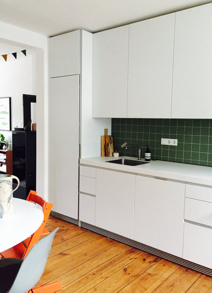 Alt trifft Neu: Die grünen Fliesen waren schon vorhanden. Der Familie gefiel die Idee, etwas Vorhandenes in die neue Küche zu integrieren. Wenn wir Christina besuchen kommen würden, gäbe es übrigens eine Summerbowl und zum Nachtisch Rhabarber-Crumble.