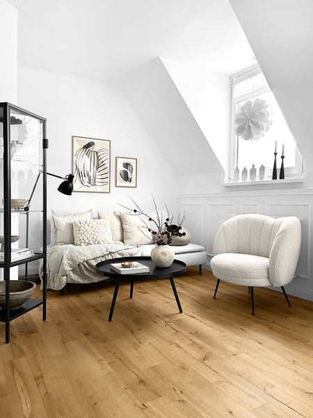 Es sind einige Stockwerke, die Sarah alias @sarahs_scandi_home zurücklegen muss, um in ihr kleines Refugium unterm Dach zu gelangen. Doch die Mühe lohnt sich: Oben angekommen, erwarten sie 46 gemütliche Quadratmeter, die sie seit letzten Sommer bewohnt und mit viel Liebe zum Detail im skandinavischen Stil gestaltet hat.