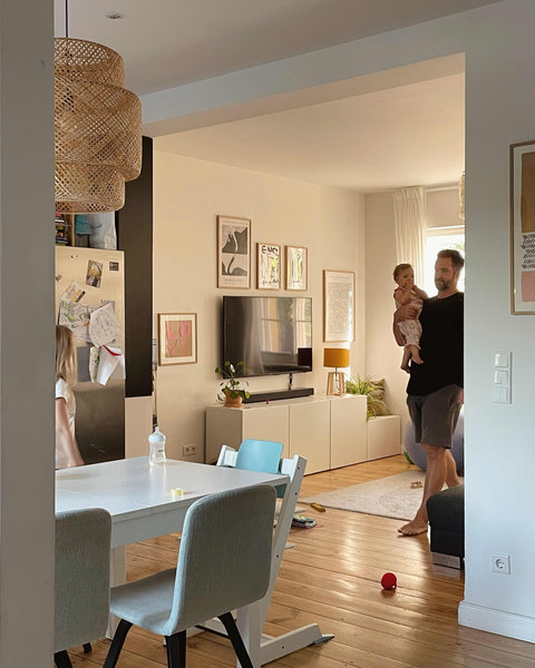 An der Wand im Arbeitszimmer hängt ein Foto von der „coolsten Socke überhaupt“, wie Katha ihre Tochter nennt. Im Wohnzimmer fügen sich eine stimmungsvolle Bilderwand, ein TV-Schrank von IKEA sowie der Wollteppich von Otto Landshut zu einem gemütlichen Ensemble. Die kleine Tischleuchte ist von Maisons du Monde. Ihre Kissen kauft Katha gerne bei IKEA oder H&M Home.