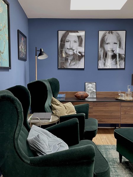 Zwar gibt es im Haus nicht so viele farbige Wände, im Arbeitszimmer jedoch trifft ein kräftiges Blau auf dunkles Holz und grüne Loungesessel. Letztere hat Katha bei IKEA ausgesucht, das Sideboard ist von JYSK. Die Bilder an der Wand sind ein Geschenk von Katha an ihren Mann.