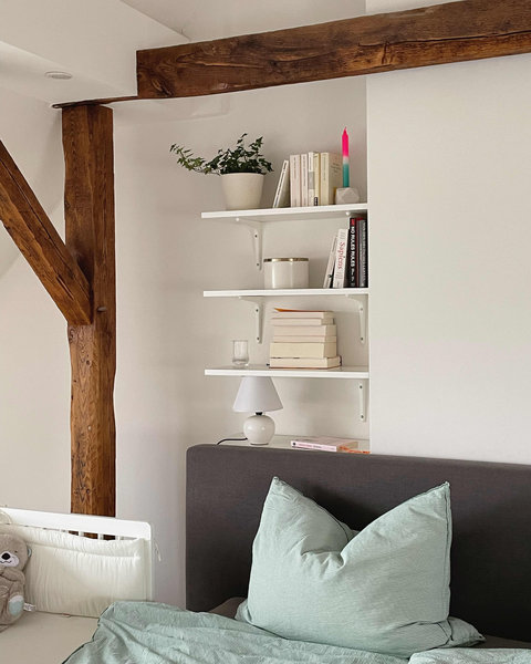 Neben dem 100 Jahre alten Dielenboden und den Deckenbalken zählt auch Kathas alter Kleiderschrank zu ihren Holzfavoriten. Ihr bequemes Bett von Swiss Sense würde sie als Glückskauf bezeichnen.