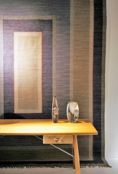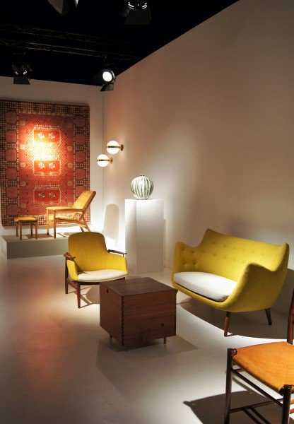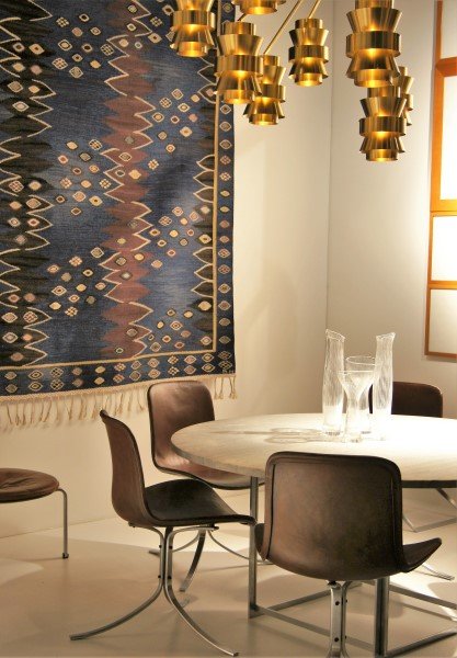 Der Galerist François Laffanour aus Paris hat sich auf die Arbeiten von Le Corbusier, Prouvé, Perriand und Jeanneret, spezialisiert, er vertritt aber auch zeitgenössisch Künstler wie Ron Arad. Wandteppiche auf dem Stand von Dansk Møbelkunst und dem wunderschönen Leuchter von Aage Porsbo produziert von Kemp & Lauritzen, einem Entwurf für die Kirche Skovlunde in Dänemark, waren leider schon verkauft.