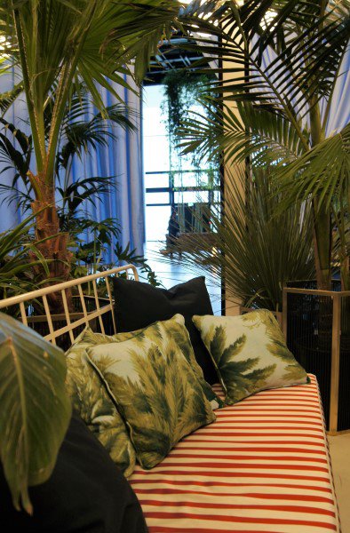 Im Erdgeschoss "Design at Large" mit einen Pavillion "Verende" des jungen Studios dimori, das an einen Wintergarten erinnern soll. Die Bepflanzung ist an den italienischen Film "Der Garten der Finzi Contini" angelehnt. Ein Ventilator sorgte für Wind und bewegte Vorhänge, ein tolles Erlebnis. Ein Raum, in dem die Zeit gefühlt stillstand.