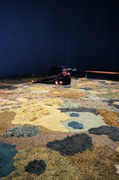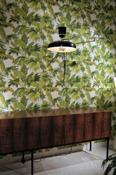 Pflanzen an der Wand und ein Stand nur mit französischen Vintage Möbeln, wie hier das eine von zehn existierenden Exemplaren des Rosenholz Sideboard 816 von Alain Richard der Pariser Galerie Pascal Cuisinier. Im Eingangsbereich zu sehen war auch das Thema Natur: der Grasteppich "No Longer Creek" von Alexandra Kehayoglou, der einst Laufsteg von Dries van Noten während der Berliner Fashion Week war. Alexandra Kehayoglous No Longer Creek erinnert an eine Region im Norden von Buenos Aires, die durch Menschenhand so nicht mehr existiert, der Teppich lädt zum benutzen ein ohne negative Spuren in der Natur zu hinterlassen.