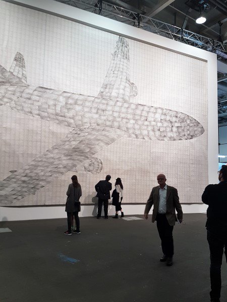 Die riesige Collage "Flugzeug (Airplane)" (Galerie Gavin Brown´s enterprise) bestehend aus tausenden kleinen Flugzeug-Fotografien, die zusammen ein großes Flugzeig bilden, begegnete uns als Erstes beim Eintritt in die Unlimited Halle. Das Werk von Thomas Bayrle entstand vor circa 30 Jahren, als es um die Erweiterung der Landebahn am Frankfurter Flughafen und die damit verbunde Lärmbelästigung ging. Es hat heute in unserer schnelllebigen und mobilen Welt nicht an Aktualität eingebüßt und steht zugleich für den großen Traum vom Fliegen.