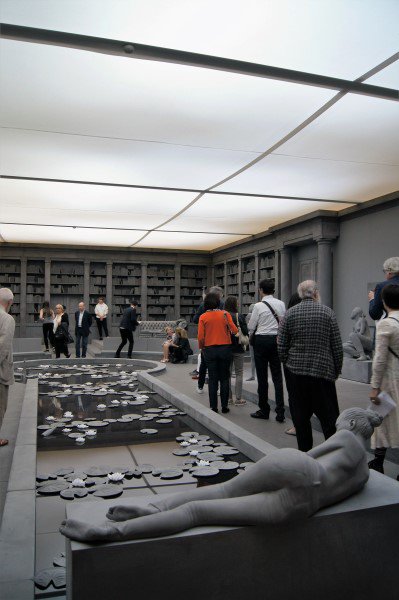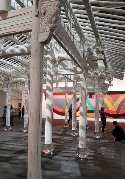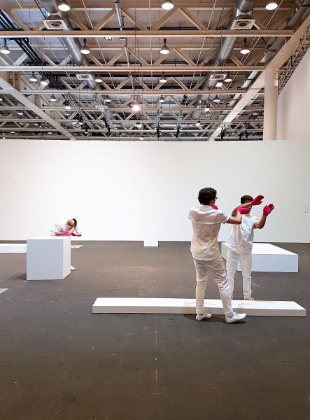 Das "White House" von Ai Weiwei, eine offene Fachwerk-Tempelkonstruktion aus der Qing-Dynastie (1644–1911), die auf Glaskugeln lagert. Dahinter zu sehen Frank Stellas Damascus Gate. Davide Balula, Mimed Sculpture, 2016 könnt ihr hier auch in bewegt sehen. Die Darsteller versuchen die Umrisse, Textur und Material bekannter Skulpturen beispielsweise Giacometti's Le-nez (1947), Eva Hesses Hang up (1966) and Louise Bourgeois' Unconscious Landscape (1967-8) nachzustellen und so eine neue Beziehung zu dem Objekt aufzubauen.