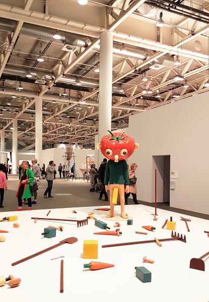 Paul McCarthys (Hauser & Wirth) "Tomato Head (Green)" Installation ging für 4,75 Mio Dollar an eine private Sammlung. Der Künstler verwendet die menschgroße Spielzeugfigur Mr. Potato Head, um die Beziehung zwischen moderner amerikanischer Kultur, Konsum und Unschuld darzustellen. Die Installation mit Dutzenden von der Decke schwebenden Koffern der Japanerin Chiharu Shiota (Galerie Daniel Templon) "Searching for Destination" wirkte auf mich beängstigend: sie weckt sofort Assoziationen von Flucht und Vertreibung. Eine der wenigen Arbeiten auf der Art, in der es um die gesellschaftliche Auseinandersetzungen ging (Bild PR).