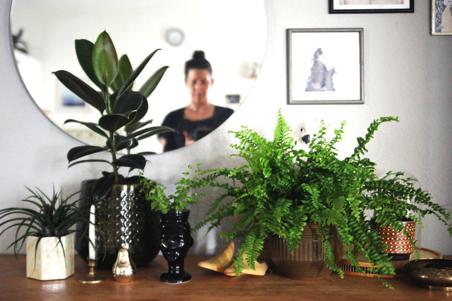 anne.marie freut sich über ihre schöne Pflanzensammlung in verschiedenen Übertöpfen