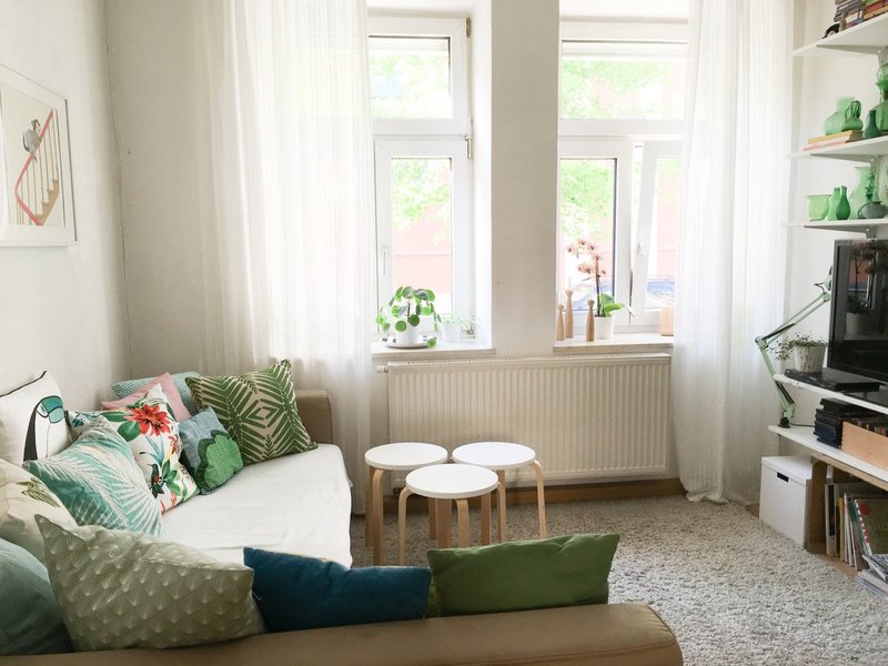 FraeulleinNussboeck dekoriert ihr Sofa mit bunten Dschungelprint-Kissen