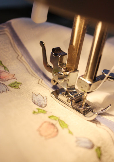 Das Fenster ausmessen, Maße notieren. Die Taschentücher sortieren, die benötigte Größe des Vorhangs mit Taschentüchern auf dem Boden auslegen (bei mir ca. 1 x 2,25 m). Jeweils vier Taschentücher aneinandernähen. Einige weitere dieser Stoffreihen nähen. Am Schluss Reihe für Reihe zusammennähen (mit Stecknadeln fixieren). Für die Stange habe ich am oberen Rand eine Öffnung zum Durchschieben genäht – dazu einfach die Stange auf den Stoff legen, in den Stoff einschlagen, mit Stecknadeln feststecken, Stange wieder entfernen und an der Markierung entlang nähen. Für den Vorhang habe ich insgesamt 36 Tücher mit ca. 25x25 cm „vernäht”.
