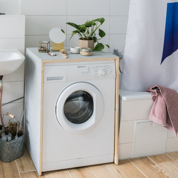 Das Holz kann ganz einfach im Baumarkt zugeschnitten werden. Massivholz beispielsweise kostet ca. 30 € und kann ohne Vorbehandlung angestrichen werden. Messt vor dem Kauf die Waschmaschine aus und addiert lieber jeweils an jeder Brettseite 5 cm dazu.