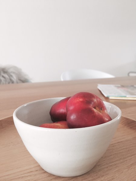 Gerardina aka @raumatmosphäre formt aus Ton eine Schale. Die schönen Ergebnisse bei ihr zu Hause: Links eine gedrehte Schale, rechts zwei Schalen aus Aufbaukeramik.