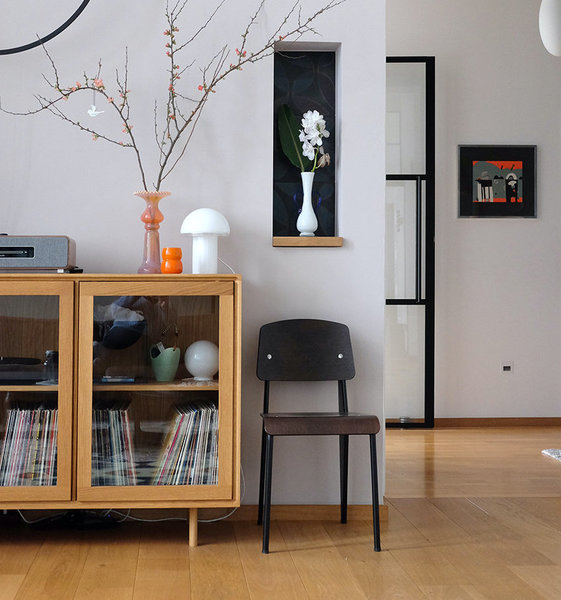 Alles sichtbar und griffbereit, ohne einzustauben: @ernebart s schlichtes Sideboard von Grüne Erde harmoniert wunderbar mit dem Boden und dient als Musikstation. Im Inneren beherbergt die Glasvitrine aus Eichenholz die sich wieder im Gebrauch befindenden Schallplatten sowie den Plattenspieler.