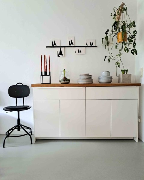 Klappe zu nach Feierabend: Ein weißer Sekretär von USM Haller dient @Bylle als praktisches Homeoffice. Die unteren beiden Fächer bieten zusätzlichen Stauraum. IKEA-Hack bei [@ruthb]: Das Sideboard gegenüber der Küche besteht aus IKEAs METOD-Schränken, die um eine Holzplatte ergänzt wurden. Neben Platz für zusätzliche Küchenutensilien bietet die Ablage genug Fläche für das griffbereite Alltagsgeschirr.