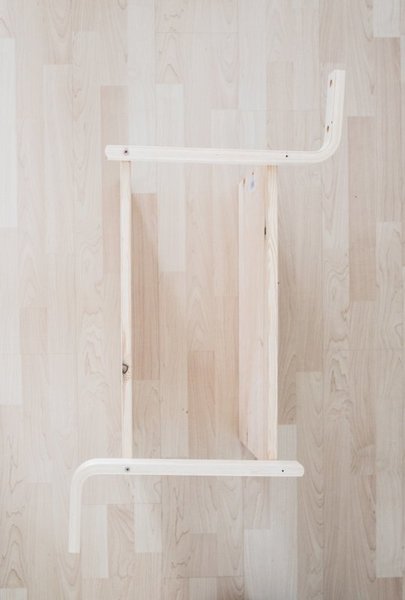 Jetzt müssen die ehemaligen Hockerbeine an die Leimholzbretter angeschraubt werden. Erst die Vorderseite und dann die Rückseite anbringen (auf einer Seite beide Hockerbeine mit dem Bogen oben und auf der anderen beide jeweils nach unten zeigend).
