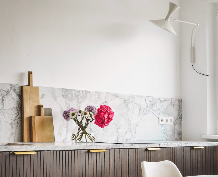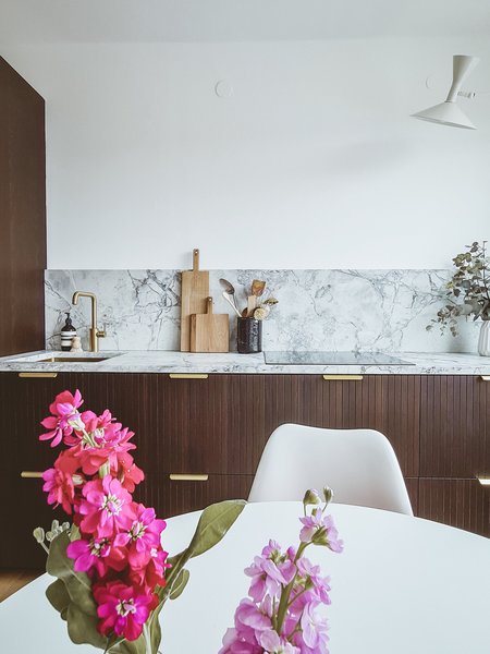 Die neuen Küchenfronten stammen von FRØPT, einem polnischen Onlineunternehmen, das für METOD- und PAX-Schränke von IKEA individuelle Fronten fertigt. Als Arbeitsplatte dient nun ein Granitstein von Granit Supreme White. Elisabeth hat ihn auch als Spritzschutz gewählt, um einen einheitlichen Look zur Arbeitsplatte entstehen zu lassen.