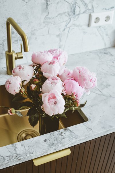 Die goldene Spüle und die Griffe hat Elisabeth bei Amazon gefunden, die goldene Armatur im Onlineshop von Damixa, einem dänischen Unternehmen für hochwertige Armaturen. Arbeitsplatte und Rückwand aus Granitstein hat Elisabeth bestellt, ohne sie zuvor live gesehen zu haben: „Der Steinhändler hatte mir Fotos vom Granitstein zugesendet. Das hat wirklich gut geklappt.“