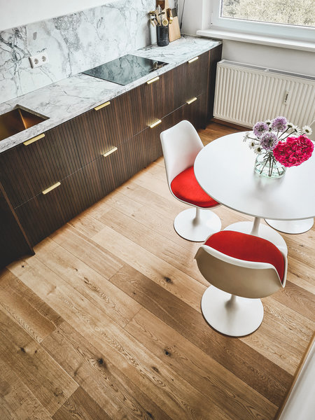 Der Küchenumbau erfolgte während des Lockdowns. Daher hat Elisabeth alles in diversen Onlineshops besorgt – so auch die Küchengeräte von Gorenje. „Ich hatte zuvor einen Retrokühlschrank der Marke und war mit diesem sehr zufrieden“, erklärt sie. Auf den höher gesetzten Kompakt-Dampfgarer mit der darunterliegenden Besteckschublade möchte Elisabeth nicht mehr verzichten: „Beide sind in einer angenehmen Höhe, sodass man aufrecht bei Küchenarbeiten stehen kann, ohne sich ständig bücken zu müssen.“