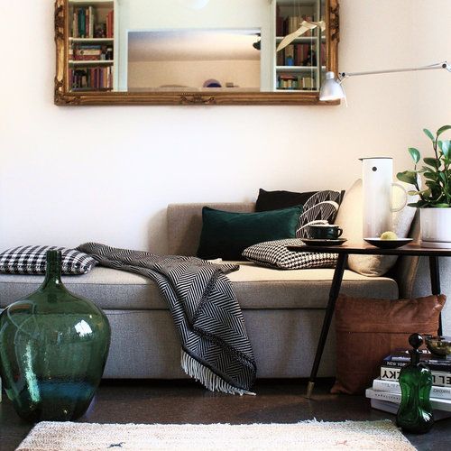 Felle, flauschige Kissen und strukturiertes Holz: Genau so wie das Wohnzimmer von [@comeback] stelle ich mir die Einrichtung eines kuscheligen Häuschens in einem von Wäldern umgebenen Bergdorf vor. Zu den weichen Textilien und natürlichen Materialien gesellen sich Möbel oder Accessoires mit Patina – und ganz wichtig: ein paar filigrane Herbstzweige in großen Glasvasen.