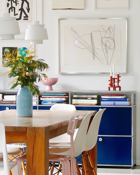 Auch in der Küche und im Esszimmer dürfen blaue Möbel gerne einziehen. Solange der Rest der Einrichtung in zurückhaltenden Farben gehalten wird, wird es auch nicht zu bunt. @Sigi H.ome nutzt gleich eine Leuchte und einen Hocker in Blau, um seiner Küche mehr Farbe zu verleihen. Bei @Lumikello sorgt ihr USM Sideboard für einen schönen Blickfang im Esszimmer.
