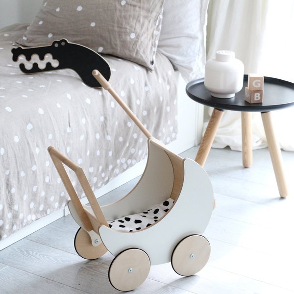 In der Kollektion der Marke Ooh Noo findet man viele schöne Kinderspielzeuge. Sie sind aus natürlichen Materialien wie Holz und Baumwolle und unterstützen Kinder, ihre Kreativität auszuleben. Besonders hübsch finden wir die Holzspielsachen. Der Spielzeugwagen in Schwarz kann zum Spielen oder als Aufbewahrung genutzt werden. Der Puppenwagen in Weiß macht sich auch als Deko im Kinderzimmer sehr gut – Puppen und Teddybären können darin ihr neues Bettchen finden.