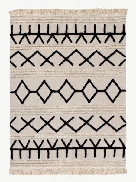 Der Lorena Canals Bereber Canvas Teppich ist mit dem grafischen Muster und den Fransen ideal fürs Kinderzimmer, aber auch fürs Wohnzimmer geeignet. Er ist waschbar und in den Größen 140 x 200 cm, 170 x 240 cm und 120 x 160 cm verfügbar.