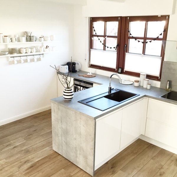 Auch in der Küche setzt Jana auf klare Materialkontraste: Das warme Holz trifft auf unbehandelten Beton, die Küchenfronten sind wie das Geschirr schlicht weiß - kleine Details wie die Wimpelkette am Fenster lockern die strengen Linien auf. Küche von Nobilia, Becher "Design Letters", Vase "Omaggio" von Kähler