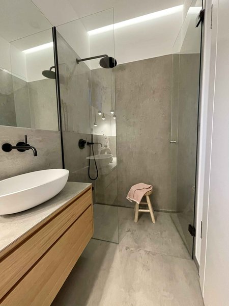 Das Verlegen der XXL-Fliesen im kleinen Gäste-WC war eine Herausforderung. „Die größte Fliese, die in der Dusche vor Kopf sitzt, ist 1,35 m breit und 2,25 m hoch“, erklärt Marta. „Am Ende musste sogar der Türrahmen ausgebaut werden, um damit in den kleinen Raum zu kommen.“