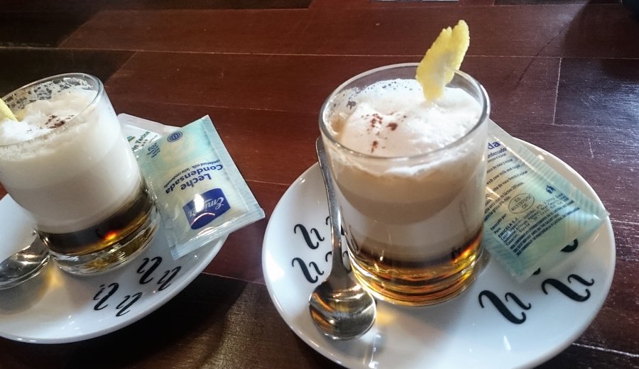 Den sehr speziellen Barraquito: ein Getränk aus Espresso, Kondensmilch, aufgeschäumter Milch, Likör und Zitronenschale. Unbedingt probieren!