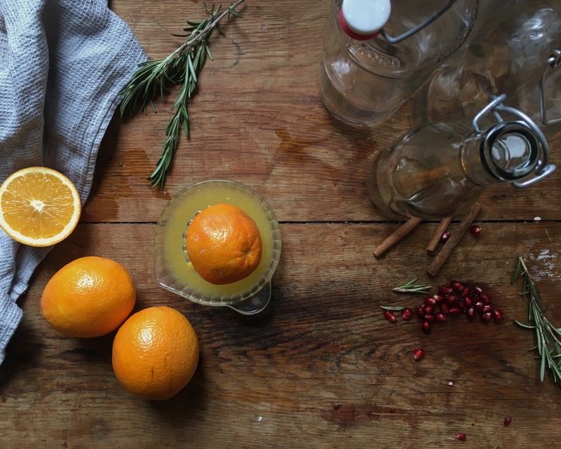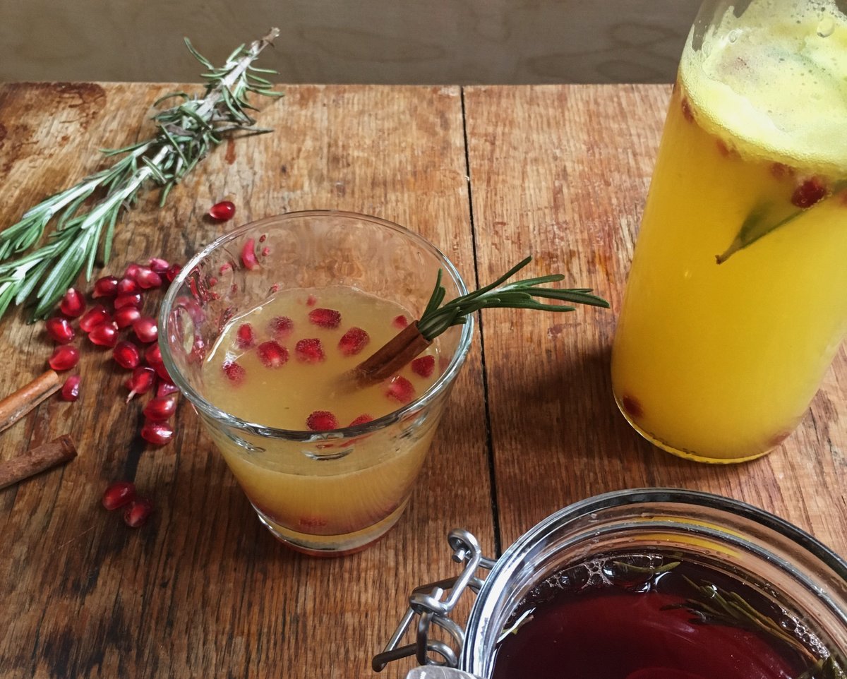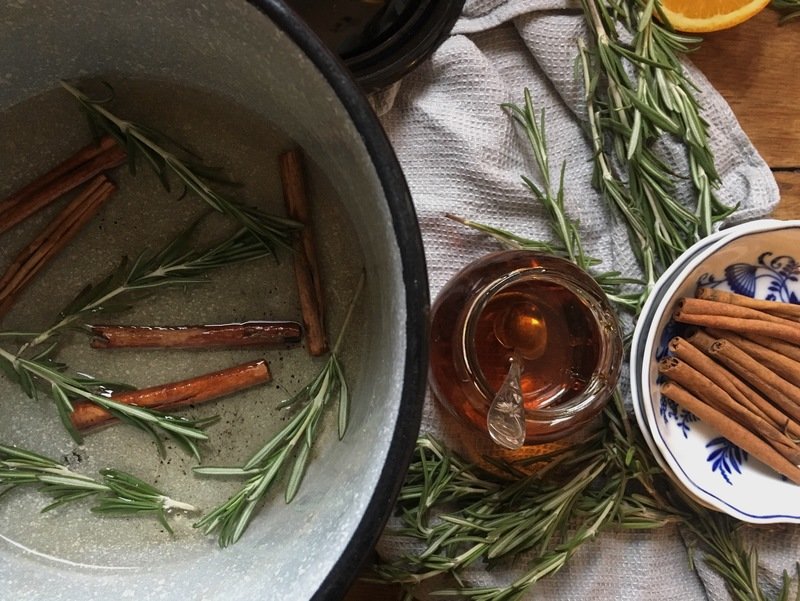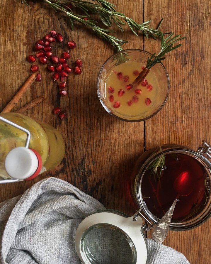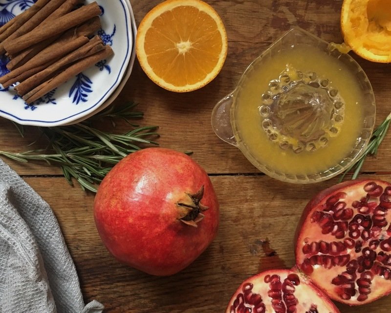 Zunächst wird ein würzig-süßer Sirup gekocht: Rosmarinzweige, Zimtstangen und Honig in einen Topf geben, mit Wasser aufgießen, bis alle Zutaten bedeckt sind und mindestens 20 Minuten auf mittlerer Hitze köcheln lassen, bis die ganz Küche weihnachtlich duftet und die Zutaten zu einem Sirup eingekocht sind. Den Sirup durch ein Sieb abfüllen und auskühlen lassen.