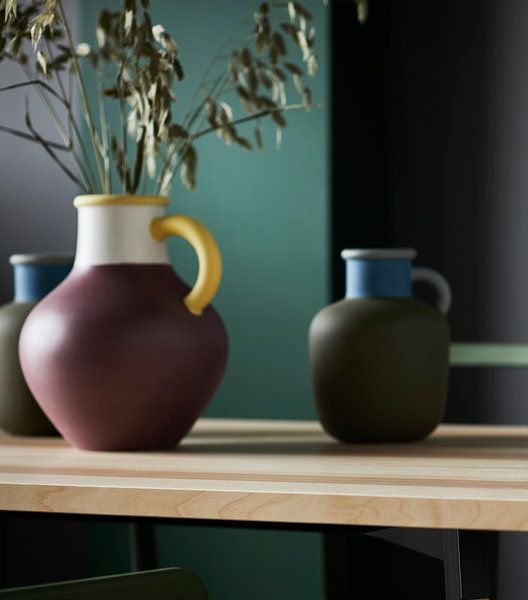 Freunde und Familie gemeinsam an einen Tisch zu holen, zu kochen und zu essen, spielt nicht nur in Skandinavien eine große Rolle. Daher darf natürlich auch bei dieser Kollektion das Esszimmer nicht zu kurz kommen. Für den Ypperlig-Holzesstisch wurden massive Holzbeine mit einem dunklen Metallgestell kombiniert. Dazu passend hat Rolf Hay den Monobloc-Stuhl entworfen, der aus nur einem Guss flüssigen Kunststoffs gefertigt und sein persönlicher Favorit aus der Ypperlig-Kollektion ist. Mit handbemalten Steinzeug-Vasen und Tabletts in Erdtönen liefert Ypperlig zusätzlich hübsche Deko-Objekte, die sich perfekt mit den großen Möbelstücken kombinieren lassen.